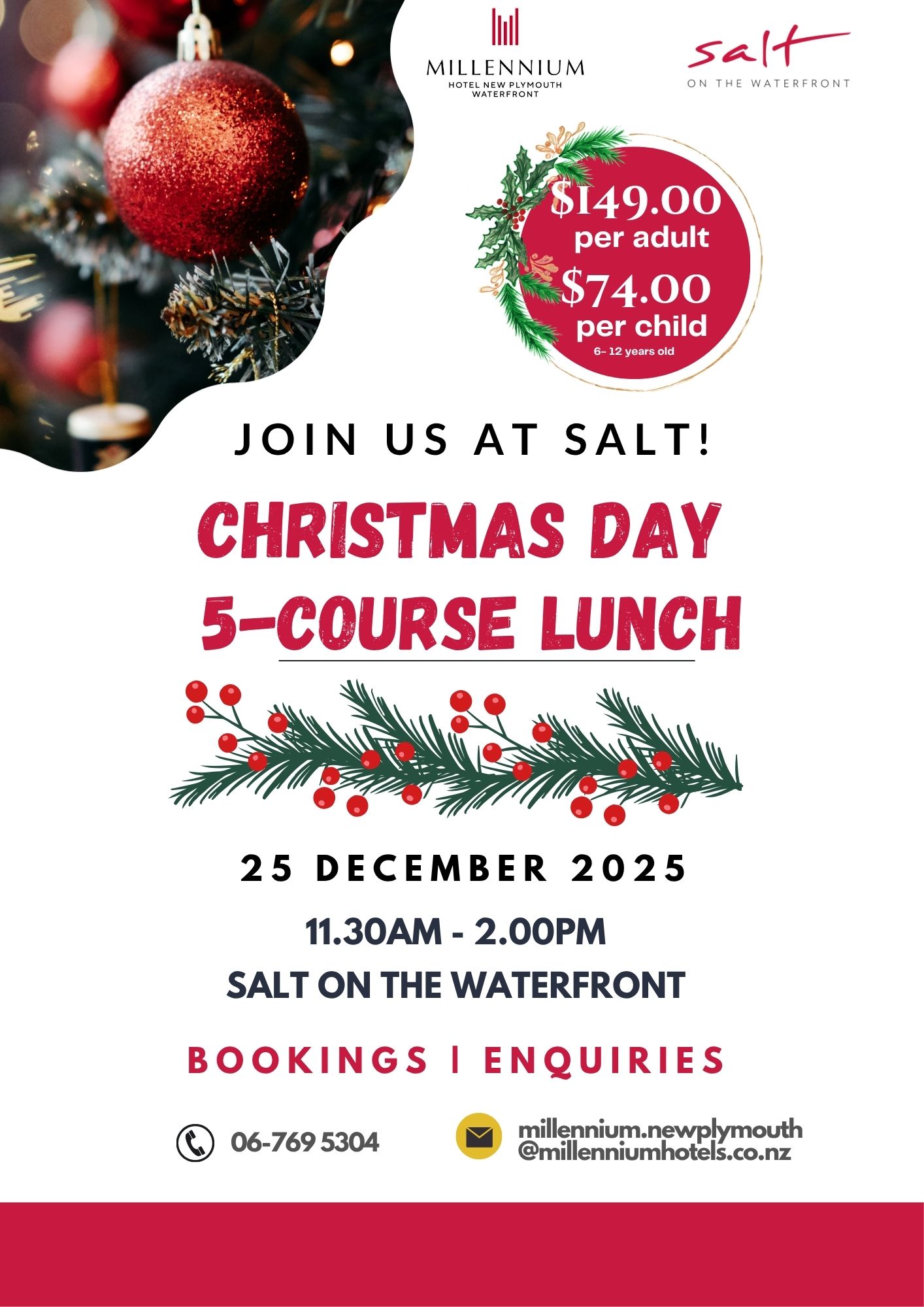 DetailsChristmas Day 5-Course Lunch 25th December 2025 11:30am to 2:00pm $149 per adult and $74.00 per child (6 to 12 years old) Book online now or call 06-769-5304